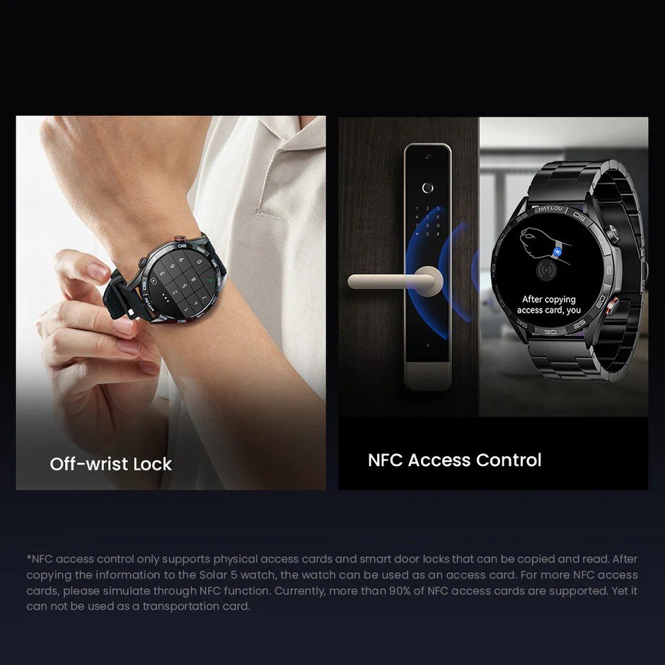 Haylou Solar 5 supports NFC access control and off-wrist lock screen functions. Just tap the access card on the watch to quickly open the door. The smart off-wrist lock feature automatically detects when you’re not wearing it and secures the screen, always protecting your privacy.